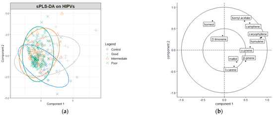Analysis of foliar HIPVs across the 14 tested clones and the three sample collection periods was carried out via sparse partial least-square regression-discriminant analysis (sPLS-DA) in R statistical software version 4.0.3 [28] with the ‘mixOmics’ package [29,30]. The number of components was selected based on the minimum balanced error rate (BER) [31]. Accuracy of the sPLS-DA model in predicting an individual ramet’s performance group was based on the receiver operating characteristic (ROC) curve [32]. Repeated measures ANOVA and Tukey’s honestly significant difference (HSD) posthoc analysis of individual compounds comparing means across performance groups and sampling periods was completed in JMP Pro version 15.2.0 [33].
