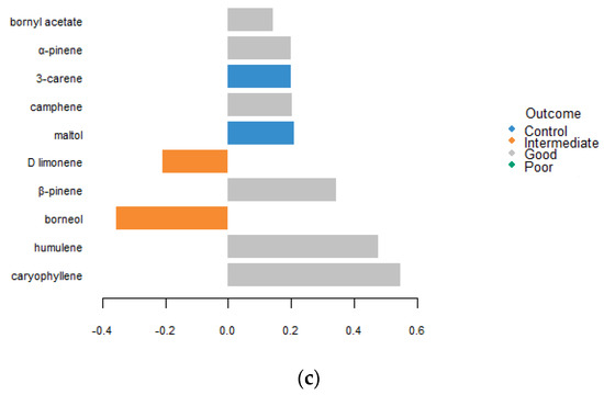 sPLS-DA analysis based on six components reveals the sesquiterpenes caryophyllene and humulene are strong predictors of ‘Good’ performing clones (those with putative resistance to BWA, Figure 2). Reduced foliar concentrations of D limonene and borneol are strong predictors of ‘Intermediate’ performing clones. Overall, identified HIPVs are only weakly predictive of the clone performance group but are moderately predictive of uninfested control ramets (Figure 3), with a control group AUC of 0.825, a ‘Good’ performance group AUC of 0.74, an ‘Intermediate’ performance group AUC of 0.749, and a ‘Poor’ performance group AUC of 0.727.