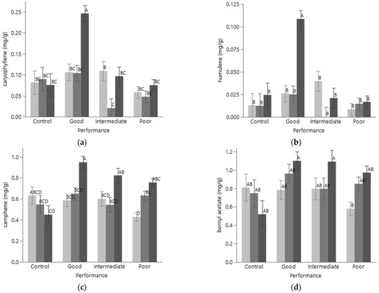Repeated measures ANOVA on individual HIPVs revealed that 9 out of the 10 analyzed compounds had significant differences in foliar concentrations based on performance group, sampling period, or an interaction of the two factors (α = 0.05, Table 1). β-pinene was the only compound without significant differences among these variables. Three compounds had distinct differences based on Tukey’s HSD posthoc analysis. Maltol, the only non-terpenoid HIPV identified, differed significantly only in the pre-infestation control group samples where it was found in significantly greater concentrations than in all infested groups (not shown). The sesquiterpenes caryophyllene and humulene had significantly higher foliar concentrations in the ‘Good’ performance group at the 20-week sampling period (Figure 4a,b, respectively). The monoterpene camphene and monoterpenoid bornyl acetate generally had increasing foliar concentrations in infested trees over time regardless of performance group, but decreased foliar concentrations over time in uninfested trees (Figure 4c,d, respectively). Slightly increased camphene and bornyl acetate concentrations were noted in ‘Good’ performing clones but were not distinctly separated from poorer performers by Tukey’s HSD posthoc analysis.