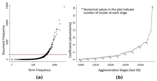 MDS and cluster analysis allow us to explore possible combinations or groups of words that share similar appearance patterns [22]. In particular, text clustering is a textual data mining method which converts the original sentences in a term-document-matrix using different feature extraction techniques [6,54]. In this way, it is possible to deduce the main elements perceived by the users (e.g., reviewers), which should be taken into consideration for an effective and rational management of the protected areas. The ease of analysis application and result interpretation are among the main advantages of the MDS [23,24]. The elaborations were carried out using KH Coder 3 software [25,39,54,55]. The KH Coder software combines two fundamental approaches of computer-based text analysis: the correlational approach, which consists in automatically extracting words from a text and analyzing them statistically; and the dictionary-based approach, which establishes coding rules for the different elements that form the text (e.g., sentences or groups of words) [55]. In order to identify the clusters of words, the Ward’s minimum variance method or Ward’s hierarchical clustering method was applied, as previously carried out by Barbierato et al. [39]. The Ward’s method is a procedure that initially generates in clusters containing single objects. These clusters are gradually aggregated in such a way as to create clusters with the highest number of objects possible, but ensuring that the variance within each cluster is minimized [56]. The Ward’s method was applied within the so-called Sammon space, which allows one to maintain a certain distance between words, preventing them from being excessively crowded and overlapping, giving more readable results [57]. Furthermore, among the options to define the distance, the cosine similarity coefficient was chosen, which is considered an efficient option in the presence of long documents (e.g., reviews) which contain, as in our case study, numerous words with an important frequency in each document [57]. A frequency threshold of 1500 terms was adopted on the basis of the term frequency–document frequency graph (i.e., TF–DF) (Figure 2a) in order to include exclusively the most representative terms that appear in several reviews. Based on the agglomeration graph (Figure 2b), it was chosen to generate seven clusters of 60 words each. For further information on the method, refer to the KH Coder software manual [57].