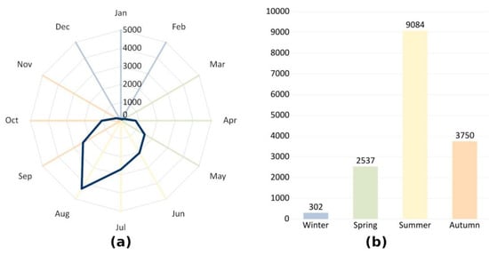 Monthly (a) and seasonal (b) distribution of reviews (average value for the period 2007–2021).