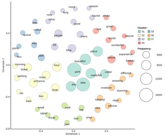 The diagram derived from the MDS method shows seven clusters of words differentiated by color [54]. The results are in Figure 6. Cluster 1 (i.e., turquoise bubbles) concerns the principal elements that characterized PLNP landscape (i.e., “park”, “lake”, “waterfall”) which are commonly associated with positive judgements (“beautiful”). Cluster 2 (i.e., yellow bubbles) is related to the theme of accessibility, including: the possible means of transport to access and/or visit the park (i.e., “boat”, “bus”, “train”, “car”); the organization into “route(s)” divided by length in terms of “hour(s)”; and the real entrance to the park, which concerns different activities, such as “parking” and the purchase of the “ticket”. Cluster 3 (i.e., violet bubbles) is a hybrid set of aspects that characterize the park, emphasizing the beauty of the site on the one hand, using terms such as “nice” and “good”, and the disadvantages related to overcrowding in the summer months of the high season, expressed by adjectives such as “many”, “long”, and “lot”. Clusters 4 (i.e., red bubbles) and 6 (i.e., orange bubbles) contain the main favorable appreciations thus synthesizable: “great”, “worth”, “wonderful”, “natural” connected to “nature”, “beauty”, and “experience” for Cluster 4; “stunning”, “amazing”, “clear”, and “different” (in the positive sense of “different” landscapes and sceneries) relating in general to the “Croatia(n)” “national” park of “Plitvice” for Cluster 6. All of the positive adjectives of the Clusters 4 and 6 are also related to the nearest central terms of the Cluster 1. Cluster 5 (i.e., blue bubbles) contains the most negative elements, referring to the main problems related to the PLNP management: the presence of “crowd” and “queue(s)” in many different “point(s)”, “path(s)”, and “way(s)” of the area. Finally, Cluster 7 (green bubbles) represents a small deepening of the nearby Cluster 2 themes, recovering the theme of the fruition through the use of words such as “walk”, “trip”, and “tour”. In this cluster, some information about the division in the “upper” and “lower” districts of the park are included.