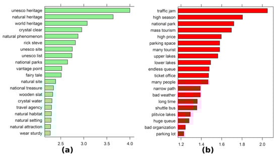 The RAKE analysis was applied to the two sub-databases obtained dividing positive from negative reviews considering the SA scores. The double-word keywords most frequently encountered in TripAdvisor reviews for PLNP were identified by the RAKE analysis (Figure 7). The most cited characteristics can be identified both in the definitely positive reviews, to be interpreted as the main strengths, and in the decidedly negative reviews, to be read as the most critical weaknesses. Definitely positive RAKE analysis results (Figure 7a)—deriving from the sub-database containing the reviews with bubbles > 3 and sentiment score > 0—show that the natural heritage and landscape elements are the most appreciated aspects of the PLNP. In particular, the “UNESCO” designation is considered as an extremely positive characteristic, as highlighted by three keywords: “UNESCO heritage”, “UNESCO site”, and “UNESCO list”. The negative results—deriving from the sub-database containing the reviews with bubbles ≤ 3 and sentiment score ≤ 0—show that the main weaknesses are represented by the phenomenon of crowding (“many people”), because the presence of a “mass tourism” during the “high season” is the cause of complex management problems, such as “traffic jam” and “endless queue” (Figure 7b). In addition to “long (waiting) time”, there are also complaints about the organization of “parking lot” and the “high price” of the entrance ticket.
