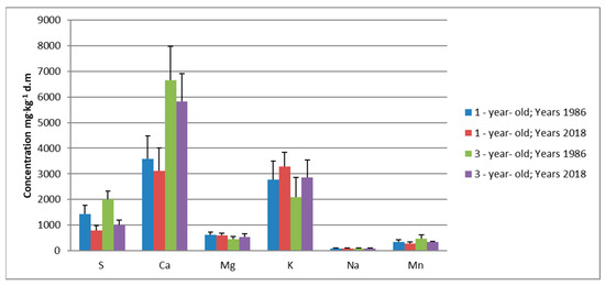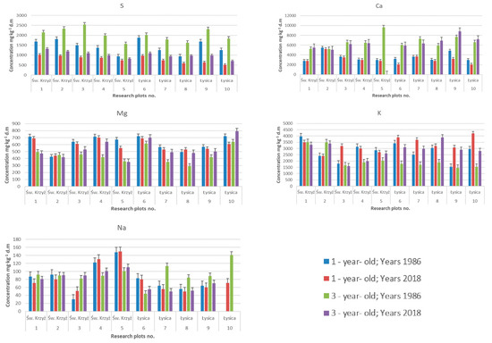 The fir needles from 1986 had higher sulfur concentrations than those from 2018. The sulfur concentrations in the fir needles in 2018 decreased by half in comparison to those in 1986. The concentrations of magnesium in the three-year-old needles from 1986 were lower than those in the one-year-old needles. The potassium concentrations were highest in the three-year-old needles from 1986. They were also characterized by higher calcium concentrations. The fir needles did not differ from each other in terms of sodium concentrations.