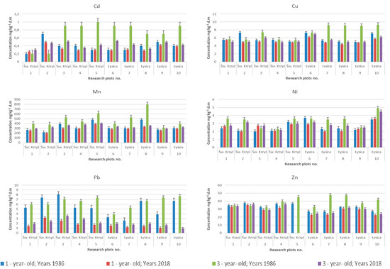 Among the potentially toxic elements, the highest concentrations were found in 1986 for Zn, at 47.60 mg·kg−1 d.m (No. 7 transect B Łysica); Cu, at 9.10 mg·kg−1 d.m (No. 8, transect B); Pb, with an average the value of 8.10 mg·kg−1 d.m (No. 3, transect A Święty Krzyż); and Ni, at 4.90 mg·kg−1 d.m (No. 10, transect B Łysica). Re-tests carried out in 2018 showed lower contents of these potentially toxic elements in the fir needles, with the lowest decrease observed in Pb (a highest value of 4.55 mg·kg−1 d.m (No. III transect A Święty Krzyż)).
