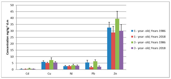From 1986 to 2018, the concentrations of cadmium, copper, manganese, and zinc in the three-year-old fir needles decreased by about 150% and the concentration of lead in the fir needles collected in 2018 was three times lower than that in needles from 1986. The concentrations of cadmium, copper, manganese, and zinc in the one-year-old fir needles did not undergo any changes.