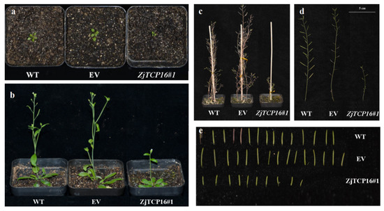 3.3. Overexpression of ZjTCP16 Resulted in Dwarfism and Smaller Leaves in Arabidopsis