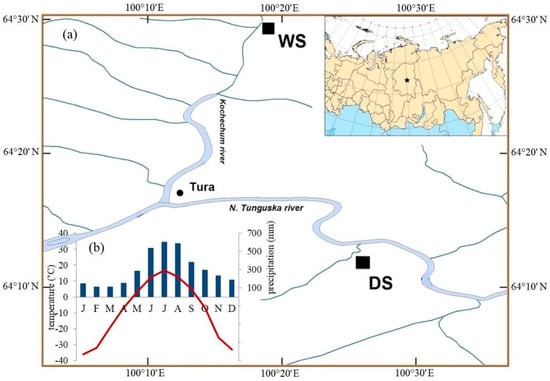 Map of the study sites (WS—wet site; DS—dry site) (a) and diagram with the main climatic characteristics of the study region Tura (b) (average values of precipitation (columns) and monthly mean temperature (line)) from the meteorological station Tura (1936–2010).