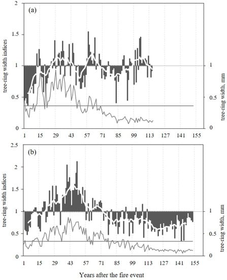 Thus, the initial decrease in TRW after the fire is most likely the result of a partially damaged tree root system, which is mainly located in the upper soil layers [46]. Furthermore, injuries in the cambium and meristem caused by the heat from the fire, take time to heal and recover. The subsequent positive trend in tree growth (until maximum of TRW) was found for up to ~30–50 years at DS and WS respectively (Figure 2 and Figure 3a). The increase in radial growth after the fire is typical for both considered sites. The warmer soil climate improves the resource availability and root expansion, facilitating an increased tree growth. The absence or reduction of competition from other plant forms (i.e., dwarf shrubs, grasses, and mosses) also contribute to a meliorated resource availability, while the absence of the insulation layer consisting of dwarf shrubs, mosses and lichens sustains an enhanced soil thermal flow. Therefore, a positive trend in tree growth can be considered as a consequence of an enlarged ASL.