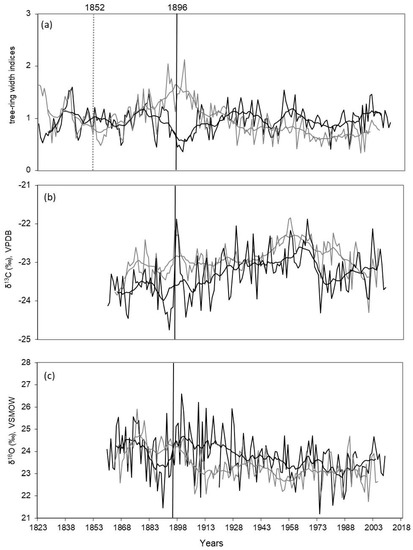 For the isotopic analyses, we selected five trees and took one or two cores depending on the mass of the annual ring at every year for each site. To eliminate the possible juvenile effect in isotope data, only material from trees older than 200 years at DBH was taken. The individual cores were split in a one-year resolution. Material for the same year from all of the cores was pooled [51,52] in accordance with the weight contribution of each sample and milled. Cellulose extraction was arried out according to [53]. Each sample was enclosed in Teflon bags and submersed in solutions of 5% NaOH and subsequently in 7% NaClO2 (sodium chlorite). The samples were then washed in distilled water and dried at 50 °C. The isotope values for carbon (δ13C) and oxygen (δ18O) were determined on extracted α-cellulose. For the determination of the C-isotope ratio, 0.6–0.8 mg were weighted into tin capsules and for the oxygen 1.1–1.3 mg were weighed into silver capsules. The 13C/12C and 18O/16O isotope ratios were determined separately by combustion or thermal pyrolysis [54], respectively, with two different Elemental Analyzers (EA1108, Finnigan, Germany and EA-1110; Carlo Erba, Milano, Italy, respectively) coupled to a mass spectrometer (Delta S, Finnigan) at the Paul Scherrer Institute (Switzerland). The long term, repeated analysis of standard materials (organics and water) yielded a standard deviation 0.1‰ for carbon and <0.2‰ for oxygen. The isotope values are expressed in delta notation relative to the international V-PDB reference for carbon and V-SMOW for oxygen. The methods used in this study for isotope analysis are described in detail in [55,56]. The obtained carbon isotope data were corrected for the decreasing δ13C value of the atmospheric CO2, which is a result of the release of 13C depleted CO2, originating from fossil fuel combustion and biomass burning in the course of land-use change. This correction was made with data from high precision records of atmospheric δ13C in Antarctic ice cores, complemented by atmospheric measurements [57]. To keep information about physiological responses to “post-fire” effect we do not use a ‘pre-industrial’ (‘pin’) correction as proposed by McCarroll et al. [58], which is a constrained non-linear de-trending of the δ13C series after AD 1850. The constraints are based on the potential physiological response of trees to increased CO2.