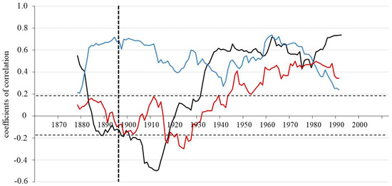 To understand the character of changes in the dynamics of the studied parameters and their response to changes in ecological condition after the fire, we carried out statistical analyses with a running correlation applying a 30-years window. The correlations between DS and WS for TRW, δ13C and δ18O of larch tree-rings for the common period from 1864 to 2005 are shown in Figure 4. Furthermore, the calculated cross-correlations between these parameters are presented in Table 2 for four equal time-blocks: before the fire in 1896 and in three periods of 30 years each after the fire.