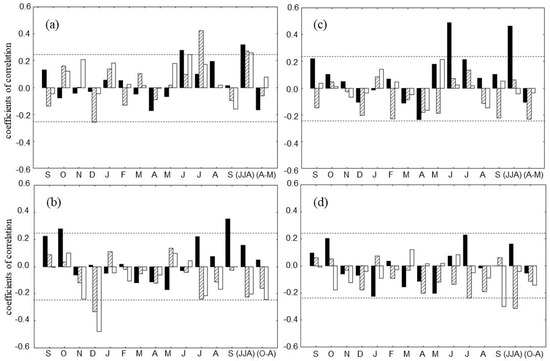 The δ18OCell values were significantly (p < 0.05) correlated with sum of summer precipitation (r = −0.45) and positive correlated with winter precipitation (r = 0.51), accordingly; p < 0.05) before 1960 only. The stable relationship in time relative to the 1960 between δ18OCell and September precipitation (r = −0.51–0.55; p < 0.05) was found.
