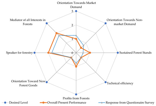 37]. As emphasised by interviewee I7, there has been a huge fluctuation in timber supply because of irregular and unpredictable forest policies and regulations. The score resulting from the closed question survey for this criterion was 1.25. Based on the information presented above, and considering the indicated lack of market competency, the performance for the criterion ‘Orientation towards market demand’ was evaluated as low (1).