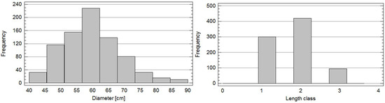 All the assortments offered at the auction corresponded to the butt log of the tree. The length of the logs ranged from 3.0 to 11.0 m (LL), and was used to sort logs into three length classes: L1 (≤4 m), L2 (4–8 m), and L3 (8–12 m) (Figure 2).
