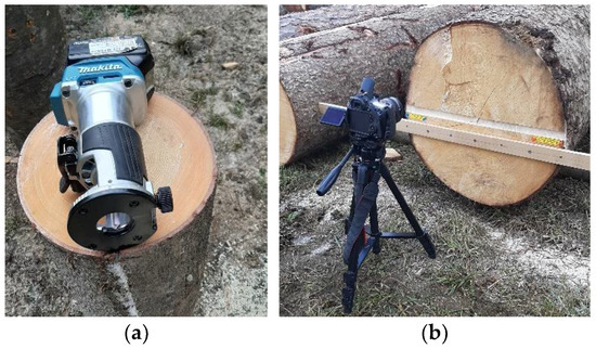 For smoothing, a hand-held cordless trimmer (Makita DRT 50ZX2, Anjo, Japan) was used to cut a groove about 25 mm wide and 5 mm deep in the cross section, from the bark over the pith to the bark on the other side. To ensure an even cut, a wooden support rail was attached to the log end, along which the trimmer was guided. The sawdust was then removed to make the growth ring boundaries visible (Figure 4a). Scale bars were attached to calibrate the images. A digital camera (Canon EOS70D, Tokyo, Japan) with tripod mount was used to photograph the radii (Figure 4b). The photos were later processed in Adobe Photoshop Elements 2020 and prepared for measurements.