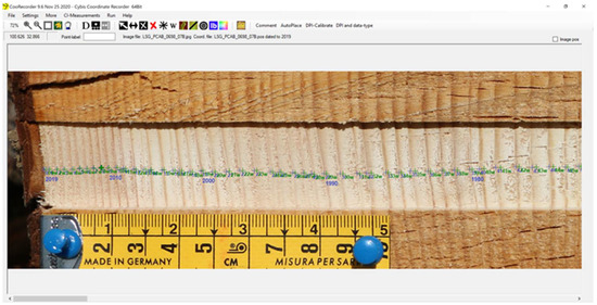 The CooRecorder 9.6 (Cybis Elektronik & Data AB) program was used for tree-ring, earlywood, and latewood width measurements (Figure 5). Tree-ring series were opened in the CDendro portion of the program for verification and conversion to *fh or *rwl format. Crossdating was performed using the TSAP Win program ® software (Rinntech, Heidelberg, Germany), and the data were processed and exported for further analysis.