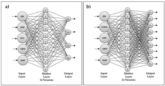An artificial neural network (ANN) [17] using a feed-forward backpropagation was chosen to model the individual variables of every log (D, ECC, L, SWV, tan δ, RW, LWP) to identify a set of features for classification. To improve the operation of the transfer functions (ƒ), the input and output data were normalized using Equation (3), which made the transfer function more effective by producing an output in the interval (−1, 1), and improved the network’s ability to generalize [17,18].
