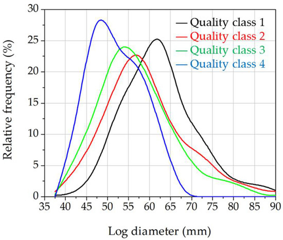 Frequency distribution of diameter of spruce logs from various quality classes (Q1 and Q2—veneer log quality, Q3 and Q4—sawlog quality).