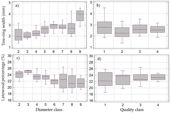 Distribution and interdependence between tree-ring width in relation to the log diameter (a) and quality class (b); latewood percentage in relation to the log diameter (c) and quality class of logs (d).