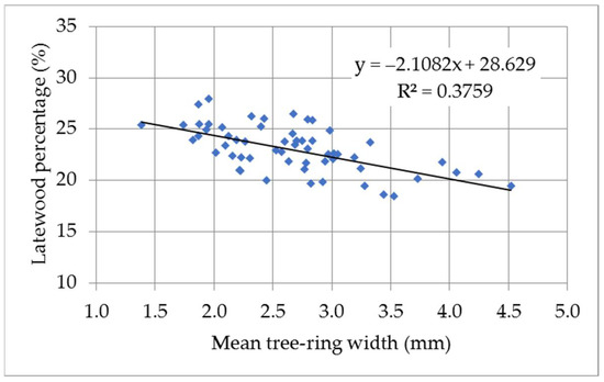 The relationship between ring width and the proportion of latewood showed a weak negative trend (Figure 9). For the ring width–latewood proportion/wood density relationship, the literature also mostly reports inverse but weak relationships [5,23,24]. The weak correlation is probably due to the significant influence of other characteristic factors, such as age-related changes in the proportion of latewood [25], climatic parameters [26,27,28], and social status of forest trees [22], which all affect latewood formation.