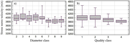 Distribution and interdependence between stress wave velocity and (a) diameter class, and (b) quality class of spruce logs.