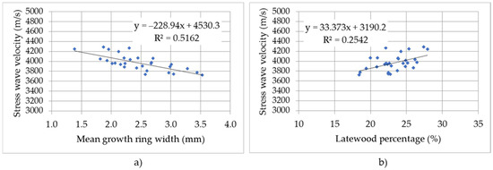 Relationship between longitudinal stress wave velocity and (a) growth ring width, and (b) the latewood percentage.