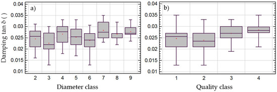 Distribution and interdependence between vibration damping (tan δ) and the (a) diameter class of logs and (b) quality class (Q1–Q4) of spruce logs.
