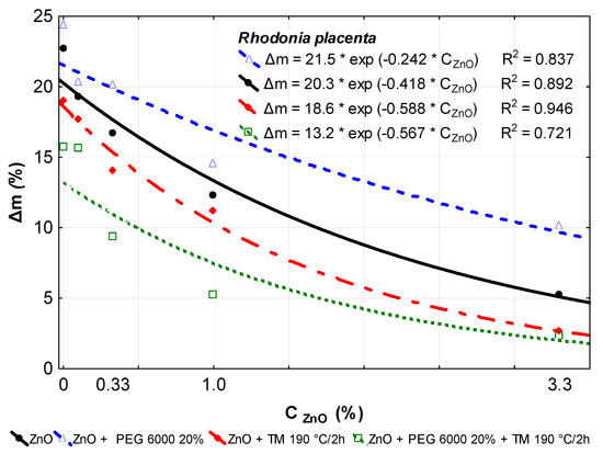 Exponential correlations between the concentrations of nano-ZnO (CZnO) used for the chemical and chemical–thermal modifications of beech wood and the decay attack of modified beech wood specimens with the brown-rot fungus R. placenta, evaluated on the basis of their mass losses (Δm).