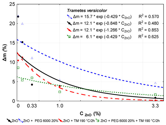 Exponential correlations between the concentrations of nano-ZnO (CZnO) used for the chemical and chemical–thermal modifications of beech wood and the decay attack of modified beech wood specimens with the white-rot fungus T. versicolor, evaluated on the basis of their mass losses (Δm).