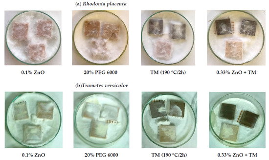 In the vaccination box (Merci, Ferrara, Italy), two specimens of the equally treated type and one reference control specimen were placed into a Petri dish with a diameter of 100 mm on plastic mats under which a fungal mycelium was already grown up on a 3–4 mm thick layer of 4.5% malt agar soil (HiMedia, Laboratories Pvt. Ltd., Mumbia, India). The incubation process took 6 weeks at a temperature of 24 ± 2 °C and a relative air humidity of 90% ± 5%. After the decay test, the specimens were dried at 103 ± 1 °C to an oven-dry state, cooled in desiccators to 20 ± 2 °C, and finally, weighed with an accuracy of 0.001 g (m/After-Fungal-Attack/) to determine their mass losses (Δm) using Equation (2):