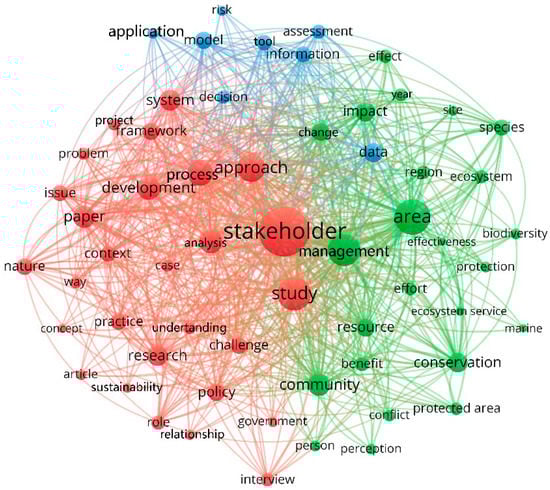 Co-occurrence network map of keywords in the global scientific literature on NPAs and stakeholders. The size of each keyword (node) in the network is directly proportional to its number of occurrences in the documents analyzed. Colors indicate clusters to which keywords are univocally assigned based on their reciprocal relatedness.