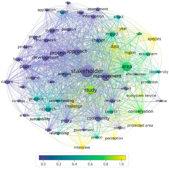 VOSviewer (https://www.vosviewer.com/ (accessed on 22 April 2022)) is a free bibliometric analysis and visualization software [] that is powerful in “co-occurrence” network clustering as well as density analysis, generating network graphs that assign the positions of displayed items accordingly based on their degree of association. Strongly correlated items are close to each other, while weakly correlated items are farther apart. To investigate trends in major themes relevant to the conservation stakeholder study, a co-occurrence map of themes was generated. Keywords co-occurrence networks quantitatively represent the connection between two keywords based on the number of publications in which two keywords appear simultaneously in the title, abstract, or keyword list. In order to visualize the most important keywords, in the choose fields in VOSviewer, select the frequency of title and abstract fields, check “Ignore structured abstract labels” and “Ignore copyright statements”. To avoid duplication in the generated network diagram, and to display the results correctly, a synonym file (replace or merge) that unifies the keywords related to the same topic is used, and the new file is reimported for operation. In addition, VOSviewer’s overlay visualization application allows network items to be represented on a temporal gradient, representing the co-occurrence of network items as a function of time, this visualization is based on the average publication year of documents in which keywords appear []. For better visualization, the number of occurrences of words in the title and abstract was set to exceed 320 in VOSviewer, and there were a total of 89 words. For synonym replacement or merging operations, invalid words were ignored, and 60 high-frequency keywords were finally obtained.