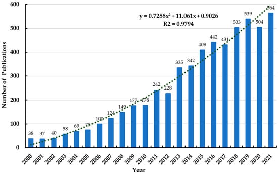 By searching the 5584 articles in the core collection of WOS, selecting the publication year and the origin or nationality of the author of the article, Figure 3 and Figure 4 are obtained. As can be seen from Figure 3, thematic research articles on stakeholders of NPAs are increasing year by year, especially after 2013, with an average annual publication volume of more than 335 articles. Among the scientific literature collected for 21 years, the number of studies in 2001 was the least (37) and the largest in 2021 (564). In addition, through the bar chart of the number of published articles per year, it is found that with the fitting coefficient R2 > 0.979, the prediction effect is better. Therefore, it can be predicted from the trend line that by 2025, the annual number of research papers on this topic will reach about 732, and even by the middle of this century, it will reach about 2376.