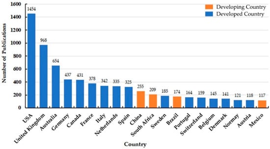 While it has been established that NPAs conflicts have a strong geographic component, previous research on NPAs conflicts had often focused on assessing the underlying causes of NPAs conflicts without considering how these conflicts have changed in the context of development []. Therefore, we guessed whether the research background in this field is related to the degree of development of the country through the number of sources (Country) and global distribution characteristics (Figure 4 and Figure 5) published in the literature, and the results are consistent with expectations. Most of the research articles are concentrated in the world’s top-ranked developed countries. For example, the United States is far ahead in terms of the total number of publications, followed by United Kingdom and Australia. While China, a developing country, has an active research program comparable to many developed countries in this field. The experience of cooperation reflects China’s contribution to the research of global NPAs.