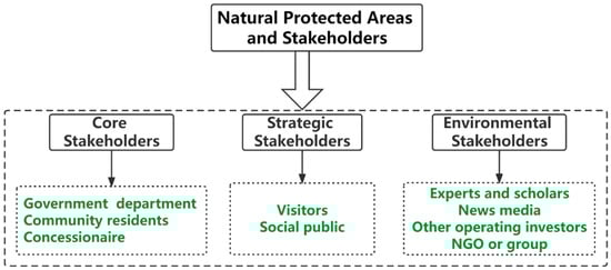 According to the stakeholder theory, any group or individual that can affect or be affected by planning objectives should be considered a stakeholder []. Accordingly, most scholars distinguish relevant research by nature reserve, national park, nature reserve, or other types, such as research objects, and specific distinctions are also made according to the attributes of the stakeholder’s interest, the relationship between the interests, and the degree of force generated. What is more, stakeholders are classified into different groups according to the stakeholder types [,,]. As early as 1997, stakeholders were divided into the definition, prospective, and potential stakeholders according to their three attributes of legitimacy, importance, and urgency [,]. Grilli et al. [], Pelyukh et al. [], and others divided the identified stakeholders into key, primary, and secondary. Different scholars have different classification methods for the types of stakeholders, but they all emphasize the importance of stakeholders, and those with a high degree of importance generally include government departments, community residents, concessionaires, and visitors.