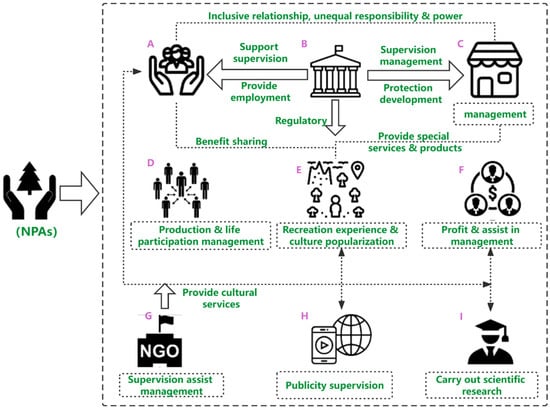 Stakeholders are guided by the goals of their own interests, and conflict games are the norm, while coordination and cooperation are the development trend. There are complex relationships among stakeholders of NPAs, involving the utilization of ecological resources, ecological protection, and ecological economic interests. By defining the rights, responsibilities, and interests of stakeholders, clarifying their mutual relationships, it is conducive to balancing the interests of stakeholders’ important pathways [].
