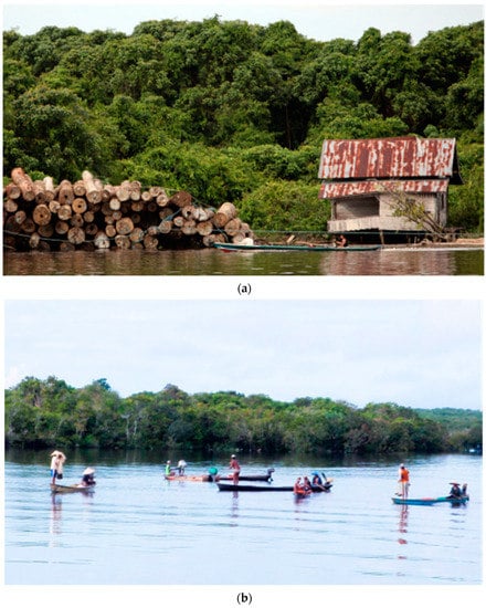Community residents demand for some natural resources. (a) “Kalimantan deforestation and degradation 3” by DFAT photo library is marked with CC BY 2.0; (b) “Communal fishing” by CIFOR is marked with CC BY-NC-ND 2.0.