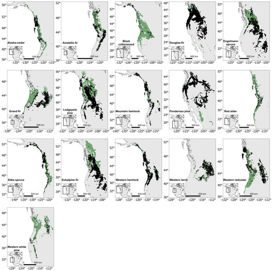Distribution of sample plots of the sixteen study species in western North America. Each map also indicates species’ geographic range (in green).