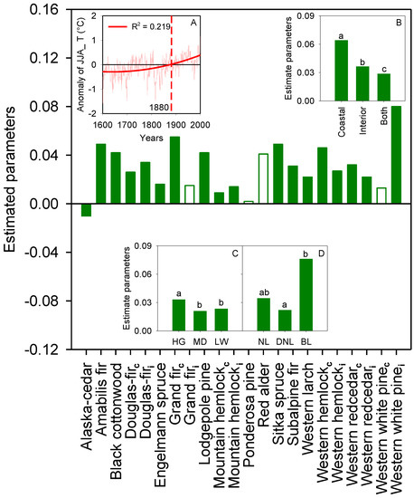 Furthermore, coastal, high-shade-tolerant, and deciduous broadleaf species and subspecies benefited the most from 20th-century warmth, while species with ranges spanning coastal and interior regions, middle-shade-tolerant species and subspecies, and deciduous needle leaf species, represented by western larch, benefited the least. This demonstrates that different growth patterns are found with different growth habits, leaf forms, and spatial environments, in line with our second and third hypotheses.