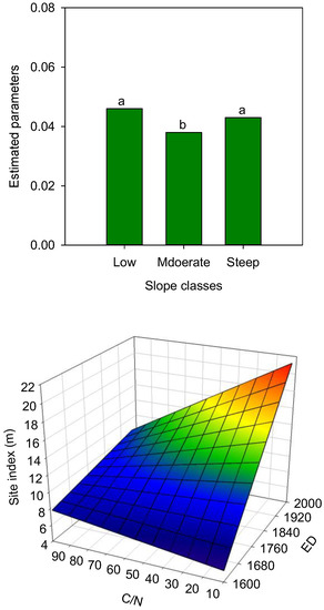 All interactions between ED and other explanatory variables had a significant effect on tree SI, with the strongest influence from the interaction between species’ range groups and ED, and the weakest from the interaction between C/N and ED (Table 3). The increase was the greatest for the coastal species’ range (group I) and the lowest for species with ranges covering both coastal and interior zones (group III; Figure 2B). High-shade-tolerant species demonstrated the greatest height increase (Figure 2C). The SI increased most for broadleaf species and was not significant for needle leaf species (Figure 2D). The greatest increase in SI was observed on low and steep slopes; additionally, it was magnified in areas with rich soil (Figure 3).