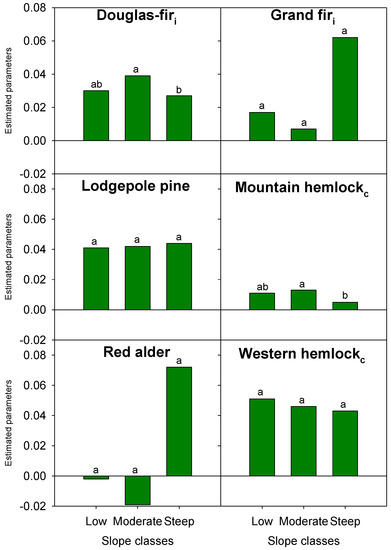 Estimated parameters of simple regression between species SI and ED for different slope classes. The letter above each bar indicates significant (different letters) or no significant (same letters) differences between the groups, shade tolerances, and leaf forms.