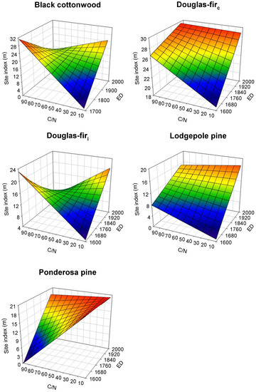 The species-specific model showed that the range of the variability of the SI explained by the model varied from 22.1% for Alaska yellow-cedar to 61.3% for ponderosa pine (Table 4). We note that this model explained more than half of the SI variability for 2 species (amabilis fir and ponderosa pine) and more than a third for 13 species and subspecies. Nevertheless, the SIs for six species were not significantly influenced by any interactions between variables.