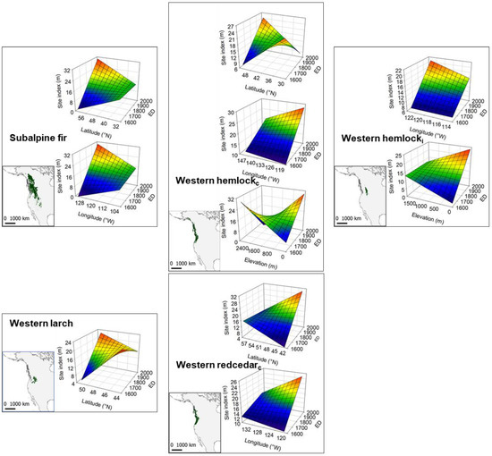 The SI–ED-induced pattern demonstrated that all species saw a greater increase at higher latitudes compared to lower latitudes except for Sitka spruce, coastal western hemlock, and coastal western redcedar, for which it was greater at lower latitudes (Figure 6). Only coastal western redcedar demonstrated a slow decline in SI at higher latitudes. In contrast, five species demonstrated a decline in SI at low latitudes. With longitudes, all significant interactions showed that the largest increase occurred moving westward, except for coastal western hemlock and redcedar, for which it increased moving eastward. All significant interactions between SI and ED at different elevations showed that all species demonstrated higher SIs at lower elevations. Further, a decline in SI occurred at higher elevations for coastal and interior Douglas-fir, coastal mountain hemlock, ponderosa pine, Sitka spruce, and coastal western hemlock.