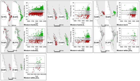 The anomaly of SI, representing the deviation from the mean of the total species SI of the study area (see Section 2.7 of Materials and Methods), differed with species, establishment date, and geographic location (Figure 7). During the warm period (1880 and afterward), Alaska yellow-cedar was the only species that had the highest and the lowest frequency of plots where the anomaly was below and above the threshold (42.86 and 11.90%, respectively). The plots of Alaska yellow-cedar with a site index anomaly below the threshold occurred mostly after the middle of the 18th century and at the northernmost portion of the species’ range. Most species that had plots with a positive site index anomaly greatly overwhelmed the threshold, especially during the warm period. However, interior Douglas-fir, Engelmann spruce, interior grand fir, and ponderosa pine had slightly more plots with negative values (Figure 7). In addition, plots with negative values, i.e., values below the threshold, occurred mostly in the southernmost extent of the species’ ranges, while plots with positive values, i.e., above the threshold, occurred mostly in the center or in the northernmost extent of the species’ ranges. Conversely, plots with positive values (above the threshold) occurred mostly in the southernmost extent of the species’ ranges for Sitka spruce, coastal western hemlock, and redcedar; to a lesser extent, the same was true for coastal mountain hemlock.