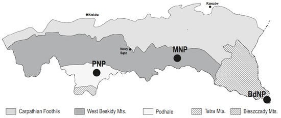 The study area was located in the Carpathian Mountains, covering the southern part of Poland. Soil samples were collected from the three Polish Carpathian national parks—Pieniny National Park (PNP), Bieszczady National Park (BdNP) and Magura National Park (MNP)—which are located in different parts of the Polish Carpathians (Figure 1).
