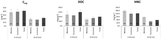 Content of total organic carbon (Corg), dissolved organic carbon (DOC) and microbial biomass carbon (MBC) in soils. The lowercase letters indicate differences between examined soil layers for individual land-use variants, while uppercase letters show differences between land-use variants separately for the 0–10 and 10–20 cm soil layers (Tukey post hoc test, p < 0.05). Standard error is reported as bars.