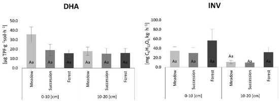 Dehydrogenase activity (DHA) and invertase activity (INV) results. The lowercase letters indicate differences between examined layers for individual land-use variants, while uppercase letTable 0 and 10–20 cm layers (Tukey post hoc test, p < 0.05). Standard error is reported as bars.