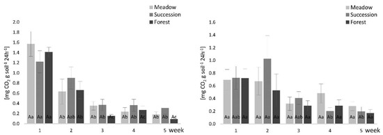 Soil respiration results for the (a) 0–10 cm and the (b) 10–20 cm soil layers. The lowercase letters indicate differences between individual weeks in the same land-use variants, while uppercase letters show differences between land-use variants for individual weeks (Tukey post hoc test, p < 0.05). Standard error is reported as bars.