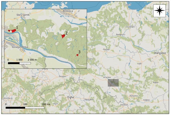 Location of the study area (gray rectangle) in SW Poland. Studied nature reserves are marked in red (1—Zwierzyniec; 2—Kanigóra; 3—Grodziska Ryczyńskie). Forests are marked in green. Background from the © MapTiler © OpenStreetMap contributors.