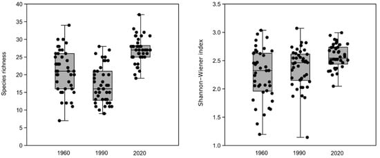 The median of the Shannon–Wiener index also increased from 2.26 (1960), through 2.37 (1990), up to 2.58 (2020). Differences in this species diversity metric (Figure 2) calculated for relevés were significant (H = 14.11, p < 0.001) between the following time periods: 1960–2020 (p < 0.001) and 1990–2020 (p < 0.05).